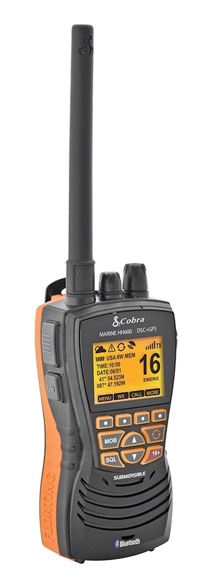 the CobraMarine® MR HH 600 VHF radio with GPS & DSC is Cobra’s first handheld radio that shows your GPS coordinates and automatically transmits them with DSC calls to notify the Coast Guard or other vessels of your exact position in case of emergency.